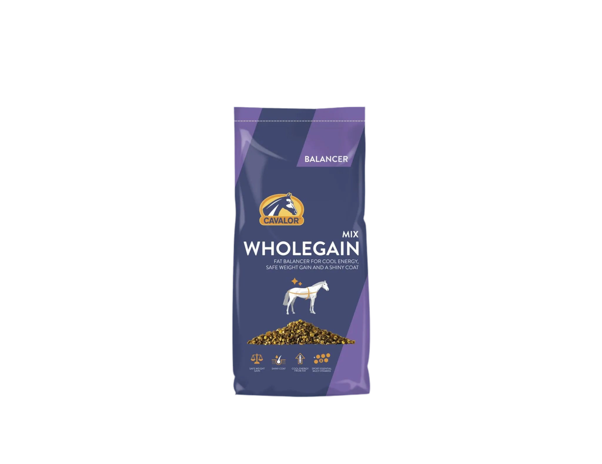 Cavalor WholeGain is a high-fat concentrated feed mix that gives fit horses shiny coats and safely stimulates weight gain. Cavalor WholeGain is a balancer that adds fat to your horse’s feed ration and provides important nutrients for sport horses, including B vitamins and minerals.